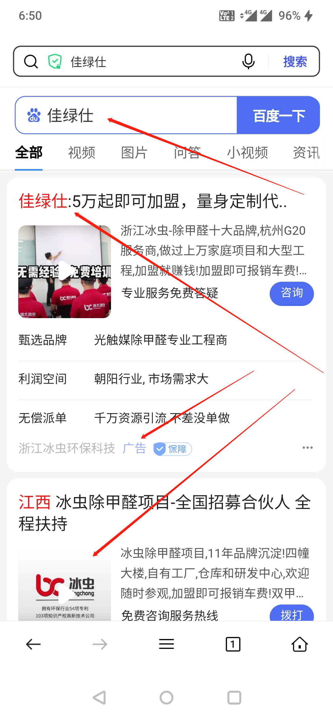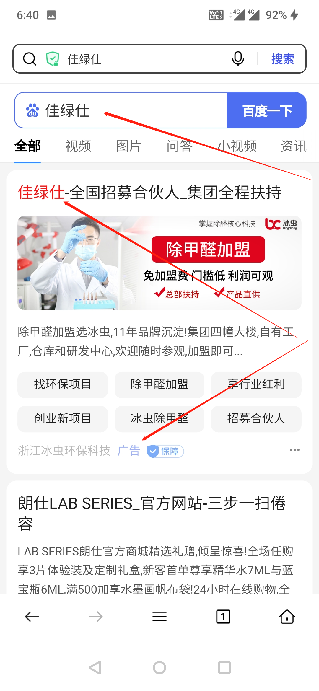 浙江冰蟲環(huán)保科技有限公司利用我司商標(biāo)"佳綠仕"進(jìn)行百度搜索關(guān)鍵詞宣傳,嚴(yán)重影響我司合法權(quán)益。